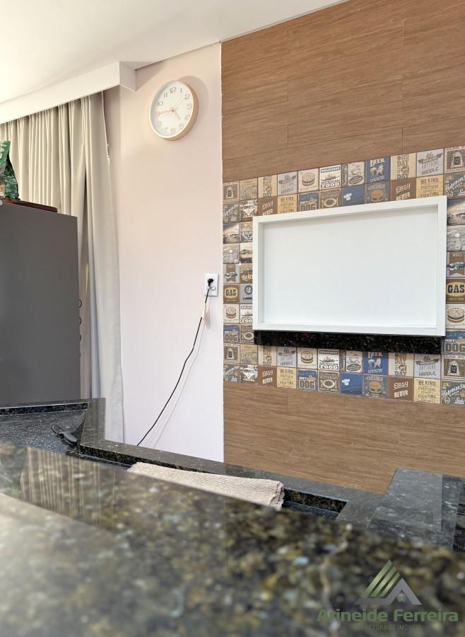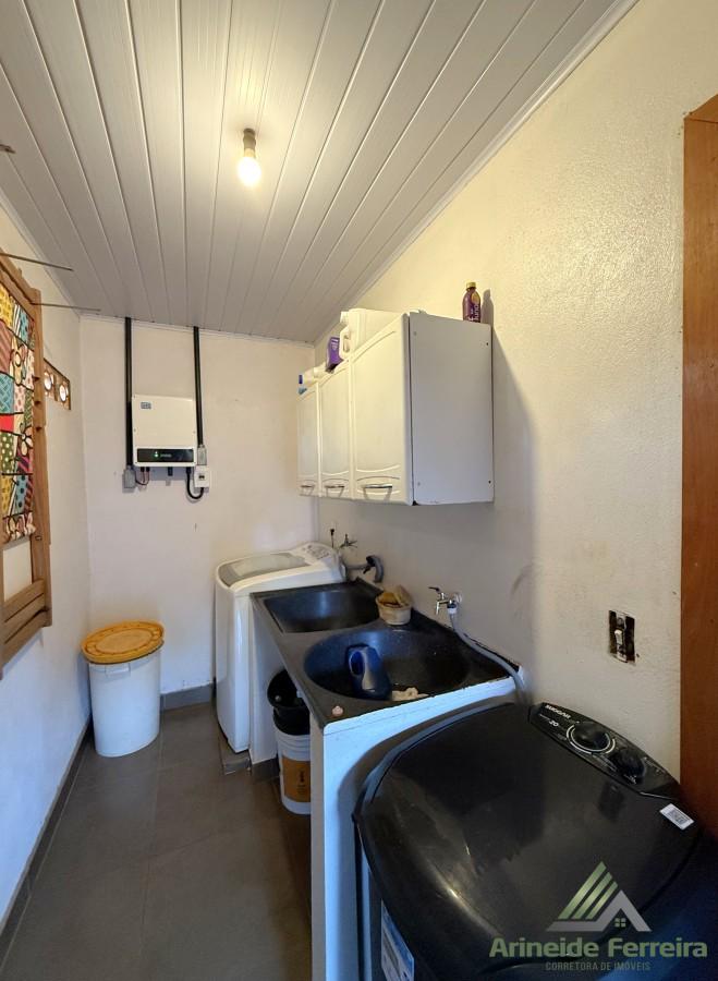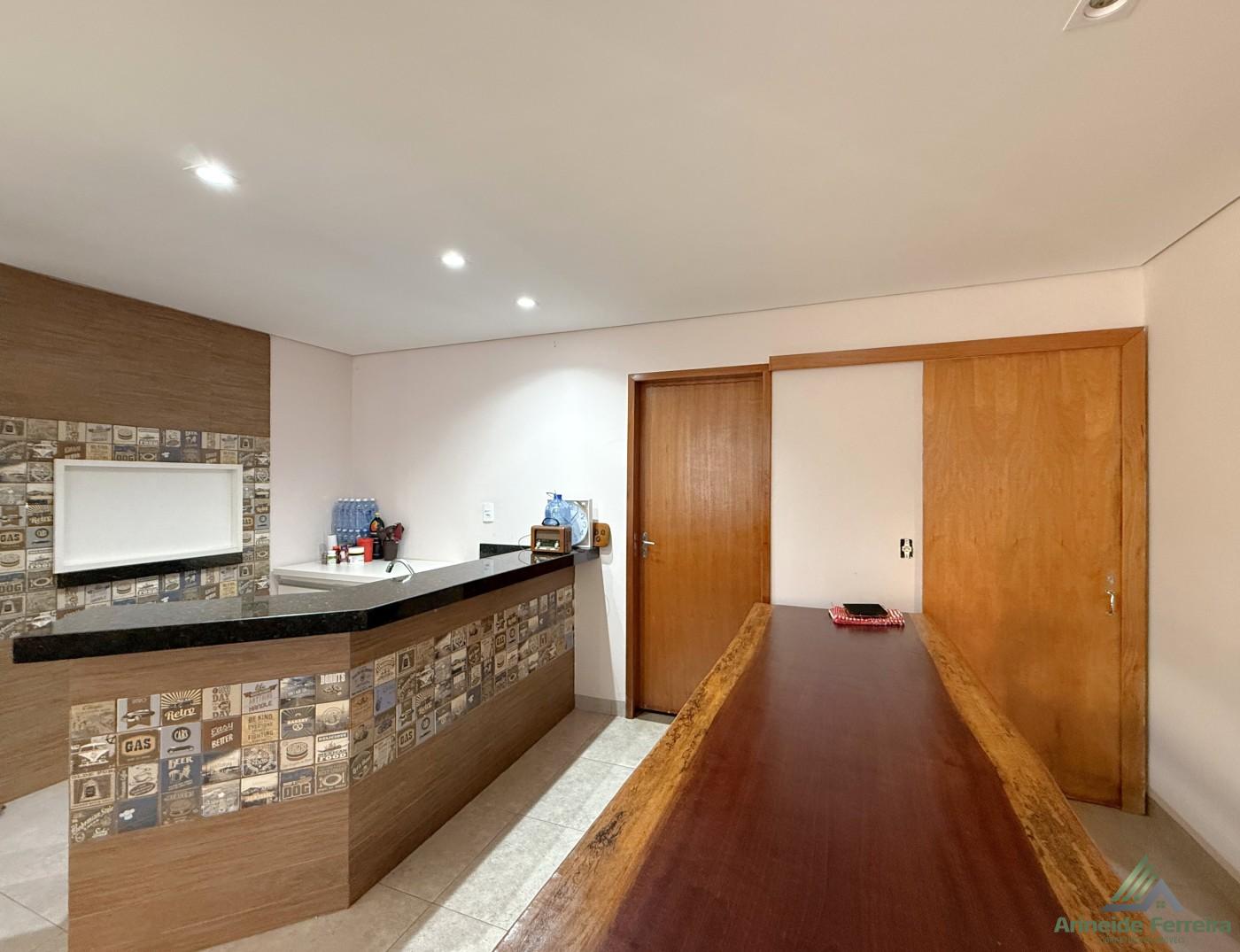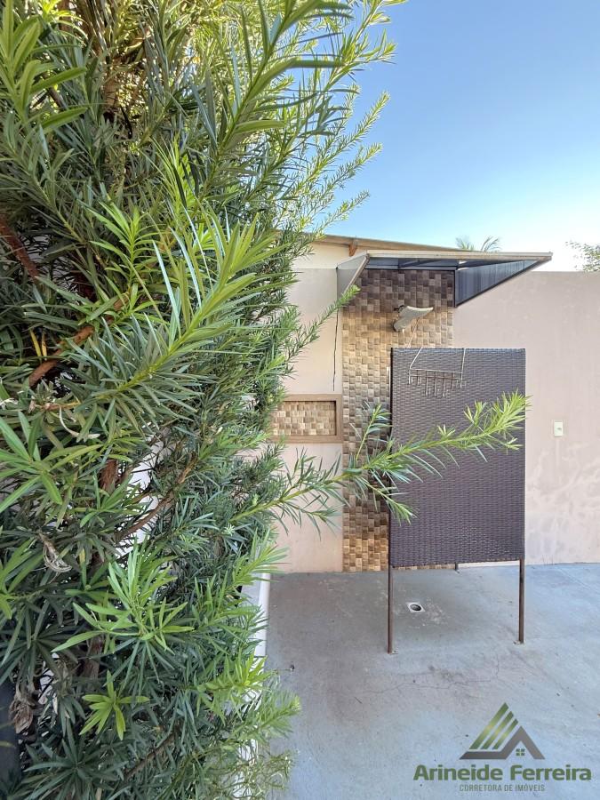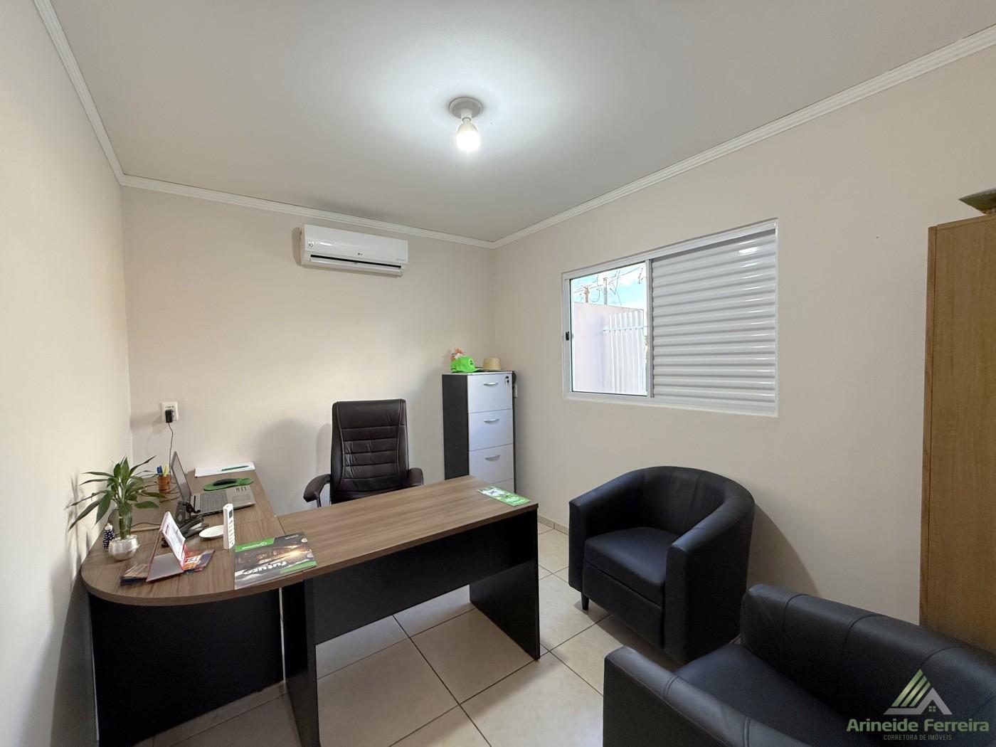 A residência principal conta com três quartos, sendo uma suíte com móveis planejados e banheiro privativo equipado com box blindex. Para maior comodidade, há também dois banheiros sociais bem distribuídos. O coração da casa é uma espaçosa sala de estar integrada à cozinha gourmet, um ambiente perfeito para receber amigos e familiares, com destaque para a churrasqueira e as bancadas de mármore. A praticidade se estende à área de serviço e a um escritório funcional composto por duas salas.